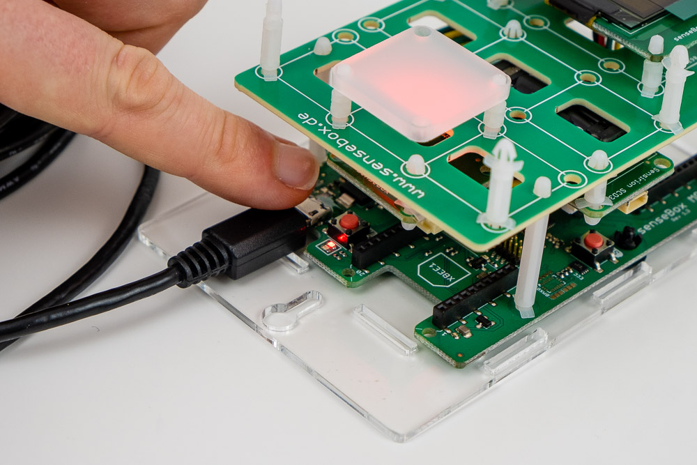 To be able to test the traffic light, you must download the programme file here and transfer it to the senseBox. To do this, connect the measuring station to a PC using the USB cable with the USB cable. There is a red button next to the USB port on the MCU. Press it twice in succession.