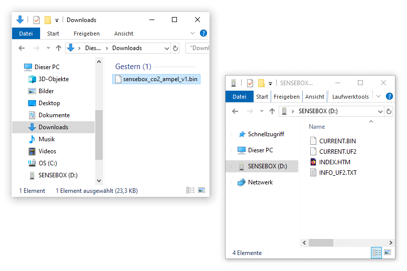 Now copy the file sensebox_co2_ampel.bin from your download folder to the "SENSEBOX" removable drive: